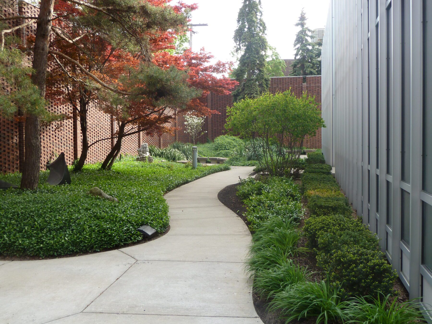 A total of three Yamasaki-designed buildings were completed in Detroit in 1958: the Detroit Society of Arts and Crafts building, the McGregor Memorial Conference Center at Wayne State University, and the American Concrete Institute. Interestingly, all three of these buildings feature a similar floor plan, with rooms arranged symmetrically on either side of a high-ceilinged central corridor, lit by skylights above. In this building, the central atrium was intended for use as exhibition space, with artists studios to each side. Prior to the expansion of the Detroit Society of Arts and Crafts (now the College for Creative Studies), East Kirby Avenue continued east of John R., right in front of the new building. Imagine a street flanked by tall trees and turn-of-the-century brick and stone houses. It was in this setting that Yamasaki designed a facade almost entirely of glass. In order to soften what would otherwise be a harsh exterior, Yamasaki surrounded the building by a brick wall enclosing an interior garden space. This wall helped what was otherwise a starkly Modern building to harmonize with its surroundings. Its perforated pattern of red bricks provides textural interest that contrasts with the smooth surface of the building's glass and steel faade. The wall also shielded building occupants from the noise, traffic, and distractions outside, creating a more intimate space within.