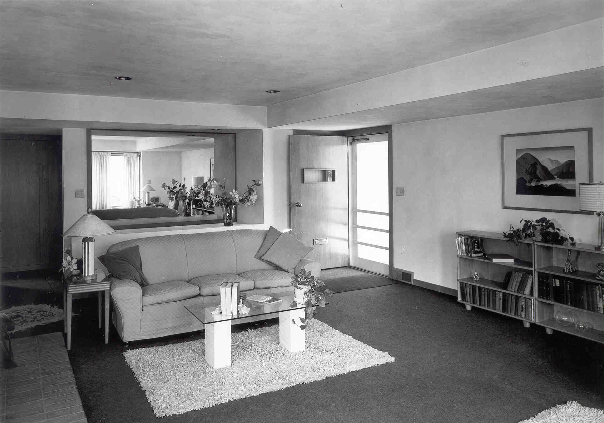 Despite its compact size and appearance, the interior living space has an open, flowing quality. The main entrance, on the west side well back from the front, opens directly into the living room of the house. To the right, a parapet wall guards the stairs to the basement. The ceiling over the stairs is curved, to allow more head room as one descends into the basement.