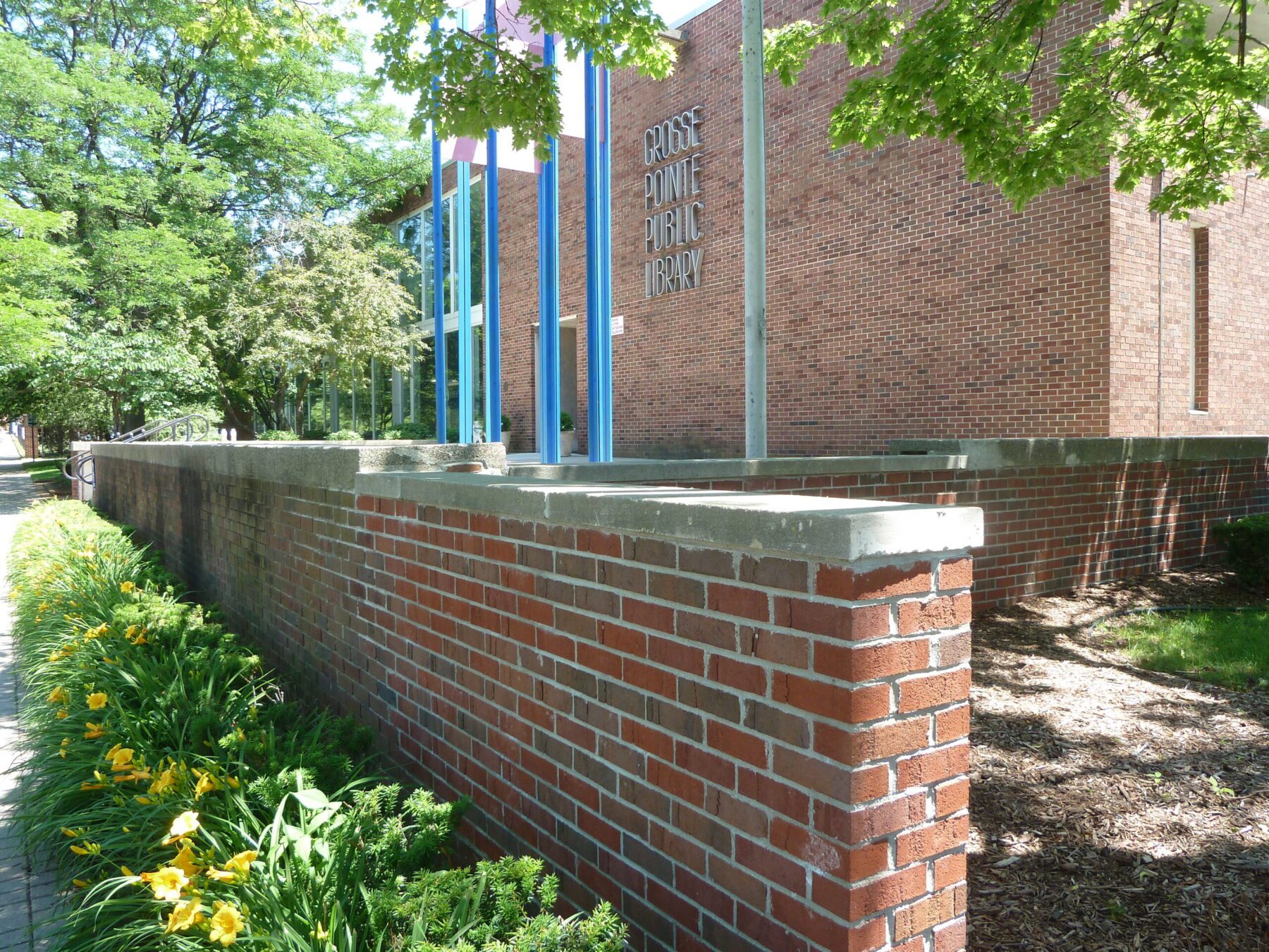 Grosse Pointe’s Central Public Library is located on Kercheval Street, a commercial thoroughfare that runs through the center of the Grosse Pointe communities paralleling the shoreline of Lake Saint Clair. The facade or north elevation of the simple, two-story, rectangular brick building is defined by large expanses of red brick and glass curtain wall. The building is slightly elevated above the adjacent parking lot and a small raised plaza surrounded by a brick retaining wall marks the location of the building’s understated main entrance. A set of concrete stairs leads from the sidewalk to the hardscaped plaza which contains a painted steel sculpture. The name of the building is presented on the wall adjacent to the main entrance in raised aluminum letters in a modernist font. The large, two-story, aluminum window wall in the center of the facade provides natural light into the reading room. The window wall also allows views to the shade garden along the front of the building. The west elevation has a full-width recessed balcony at the second floor level over eight tall, narrow, slot windows that provide light to the first floor offices. These same slot windows are found along the rear and east elevations. Secondary entrances are located along the rear elevation. The easternmost entrance is shaded by a concrete visor.