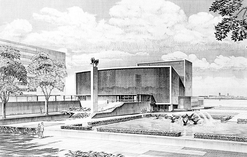The Henry and Edsel Ford Auditorium was constructed in 1955 and opened in 1956. The building was designed by the Detroit, Michigan, firm O'Dell, Hewlett and Luckenbach. The auditorium was situated between Jefferson Avenue to the north, the Detroit River to the south, Woodward Avenue to the west, and Bates Street to the east.