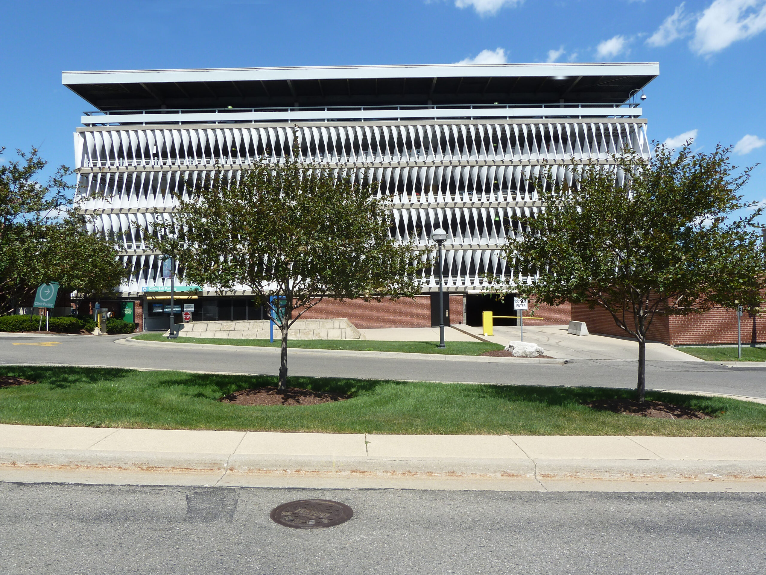 The parking structure is built of reinforced concrete and is clad with red brick at the first floor and compound-curved, white, precast concrete panels above. The red brick of the base was selected to harmonize with the red-brick cladding of the hospital's existing turn-of-the-century structures, while the precast panels were designed to screen the vehicles within and to be compatible with the surrounding residential neighborhood. The original plans called for landscaping around the base of the structure so that it would blend with the landscaped grounds of the hospital complex. The structure features an open-deck, split-level arrangement of floors, two passenger elevators and three stair wells for circulation of cars and people.