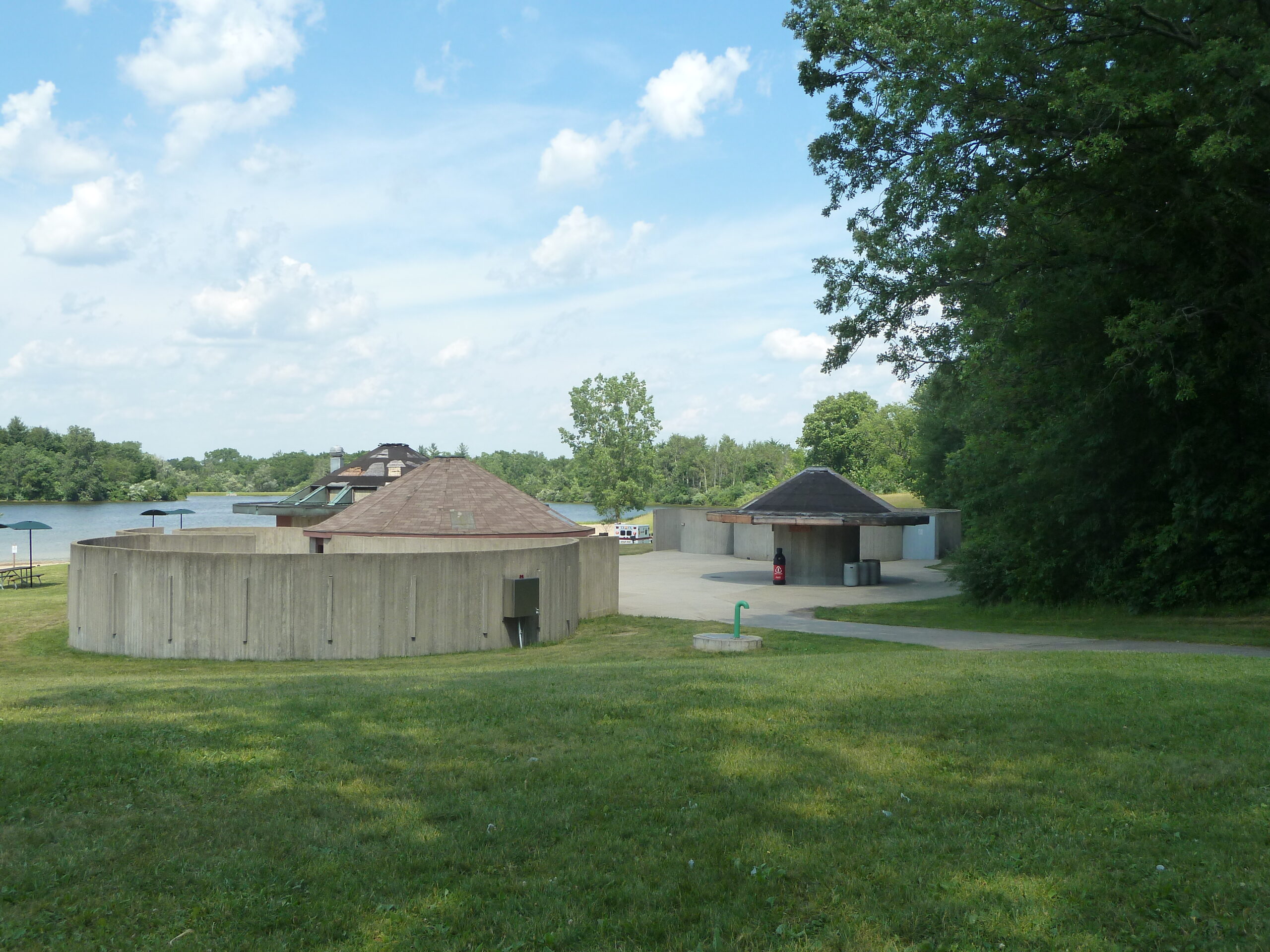 The Lower Trout Lake Bathhouse Complex and Contact Station/Bald Mountain State Recreation Area consists of a series of several structures sited in an open lawn setting against a stand of trees at the edge of Lower Trout Lake. The structures include an entry gatehouse, two bath houses/comfort stations and a concessions building to accommodate day users at the public beach. All of the buildings are circular in plan, some grouped or interlocked conveying an organic form. The exterior walls of the buildings are raw concrete, the graining of the vertically oriented wood forms providing a textured surface. The conical shaped roofs are supported on timber trusses and resemble parasols. Originally clad in copper, the roof covering has been modified to asphalt shingles on all but one building (the Concessions Building). Also, the deep projecting roof overhangs have been eliminated on the comfort station structures. The interlocking plan of the comfort station and their spiraling walls provide visual privacy for the users, thus minimizing the need for doors. The changing areas of the comfort stations are open to the air. Small changing compartments line the exterior walls and circular concrete benches provide seating. The materials used in the design of these structures were meant to be durable to withstand year-round exposure to the elements.
