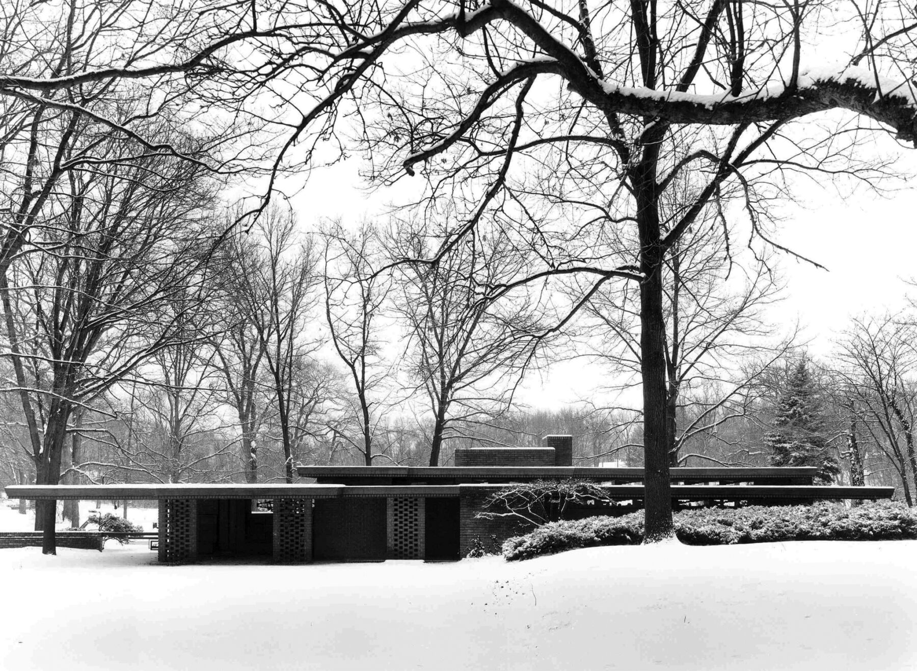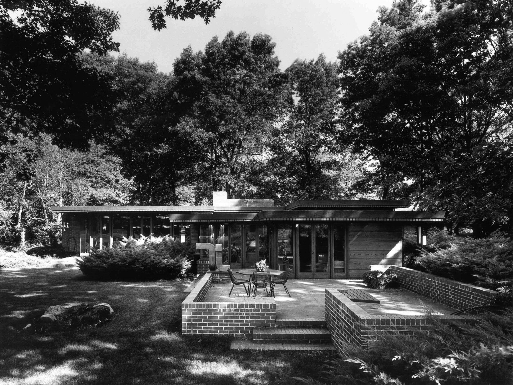 The Melvyn Maxwell and Sara Stein Smith House is a one-story structure with an L-shaped plan containing approximately eighteen hundred square feet of living space. The house is sited in the middle of an approximately three-acre lot that slopes gently from north to south and fronts onto a pond that was created in the late 1950s. The home possesses many of Wright’s characteristic design principles, including its connection to the landscape, a strong horizontal emphasis created by dramatic roof projections, and the interplay between interior and exterior spaces. The design provides privacy from the street by limiting the glazing on this elevation to narrow bands of clerestory windows and by recessing and de-emphasizing the main entrance. By contrast, the south elevation is very transparent allowing natural light to penetrate the interior and providing dramatic views of the property. The cantilevered plane of the carport roof is balanced by the brick chimney mass, which is the only vertical element in the arrangement. The exterior walls consist of sections of load-bearing brick as well as Wright’s signature plywood sandwich panels covered with horizontally oriented cypress boards with reverse battens. The windows are one-quarter-inch plate glass, and a radiant hot water heating system has been integrated into the colored concrete floor slab.