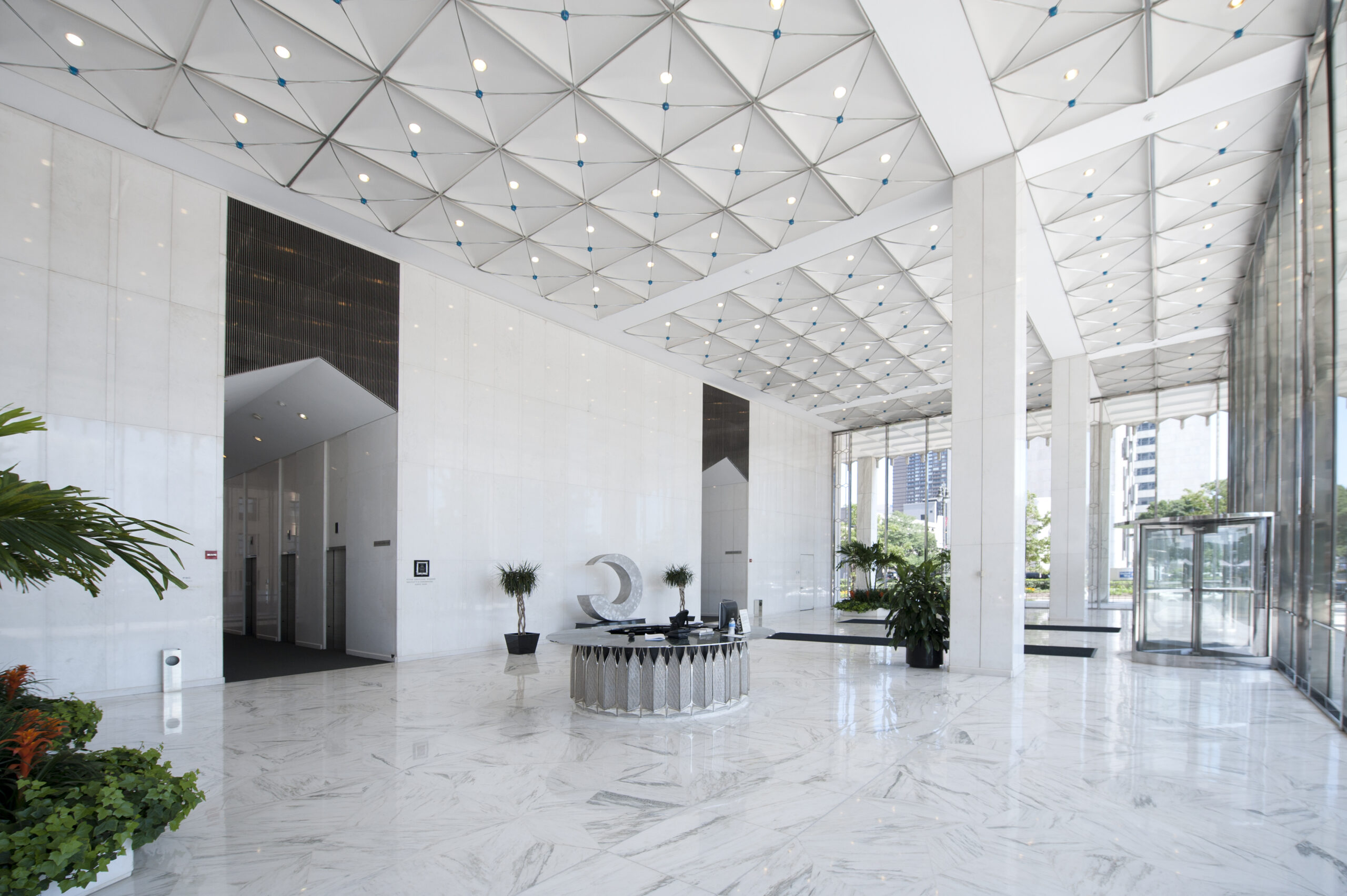Yamasaki’s rebellion against the popular International style of glass-walled skyscrapers was expressed in his design for the MichCon Building. In it, he displayed his delicate touch in creating the lightness and harmony that caused his buildings to almost float. Entrance staircases lead up to a marble platform on which the building rests. Pre-cast white concrete panels hold the vertical, hexagon-shaped windows in place. Yamasaki, who was fearful of heights, employed narrow windows spaced between numerous columns to admit light without subjecting tenants and office workers to dizzying views. Ironically, he soon went on to design the two tallest buildings in the world, the World Trade Center towers in New York City.