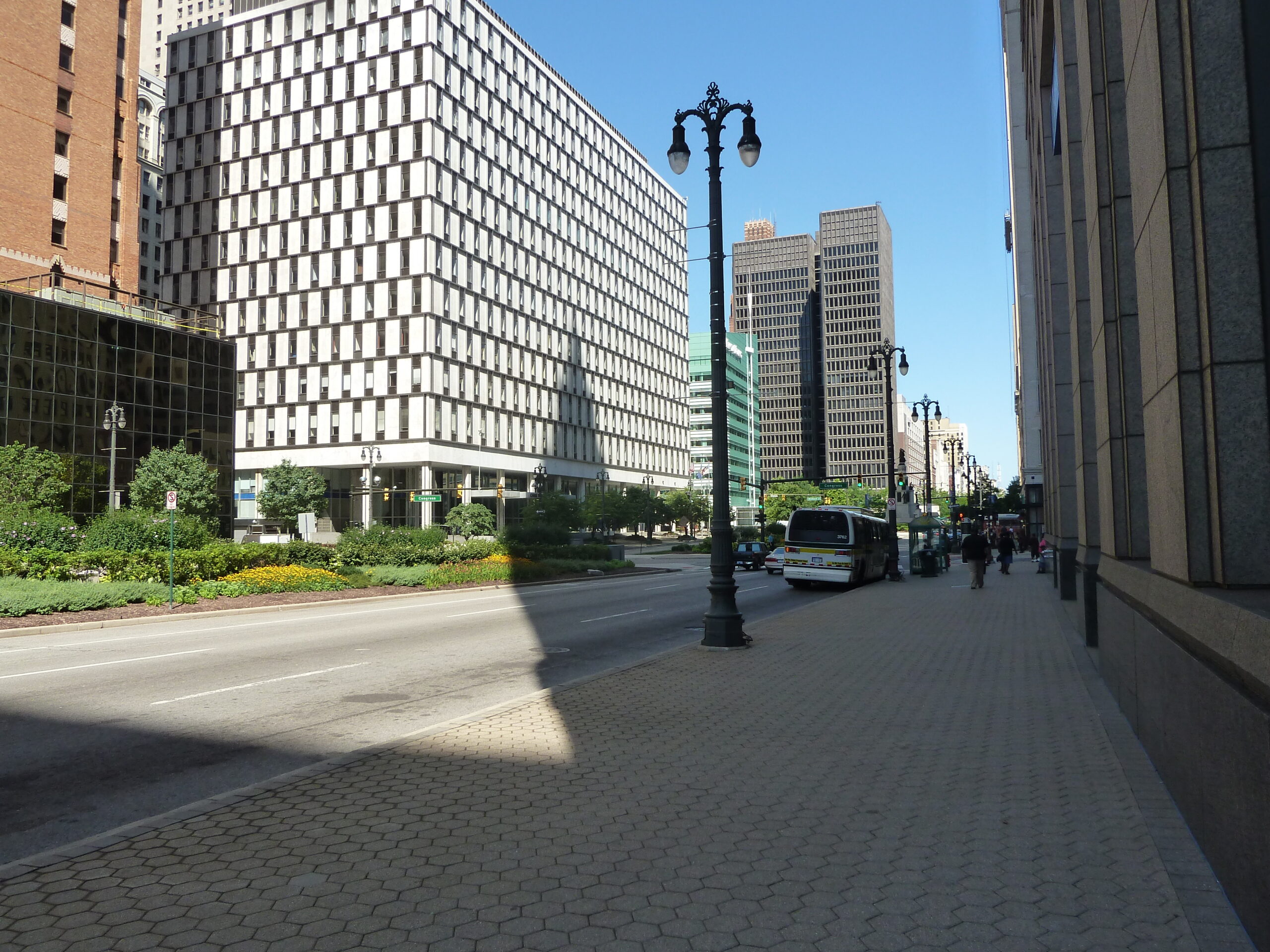 The rectangular-shaped building is set back forty feet from the street to create a generous esplanade originally shaded by a row of trees enhanced with planters. Built on the rise from the river, long horizontal steps progress to its entrance. The building's upper stories form a box that rests on a taller recessed base surrounded on all sides by a colonnade of square structural columns faced in marble. Structural columns are also spaced throughout the interior of the two-story banking room lobby space. Faced by a glass wall, this lobby interior was designed by W. B. Ford Design Associates, a well-established Detroit design firm. Above, the twelve-story curtain wall is arranged in a checkerboard fashion. Comparatively small windows with gray porcelain enamel spandrels and aluminum framing members alternate with white Georgia Cherokee marble infill panels that were chosen by the architect to harmonize with the white marble of the civic center buildings.