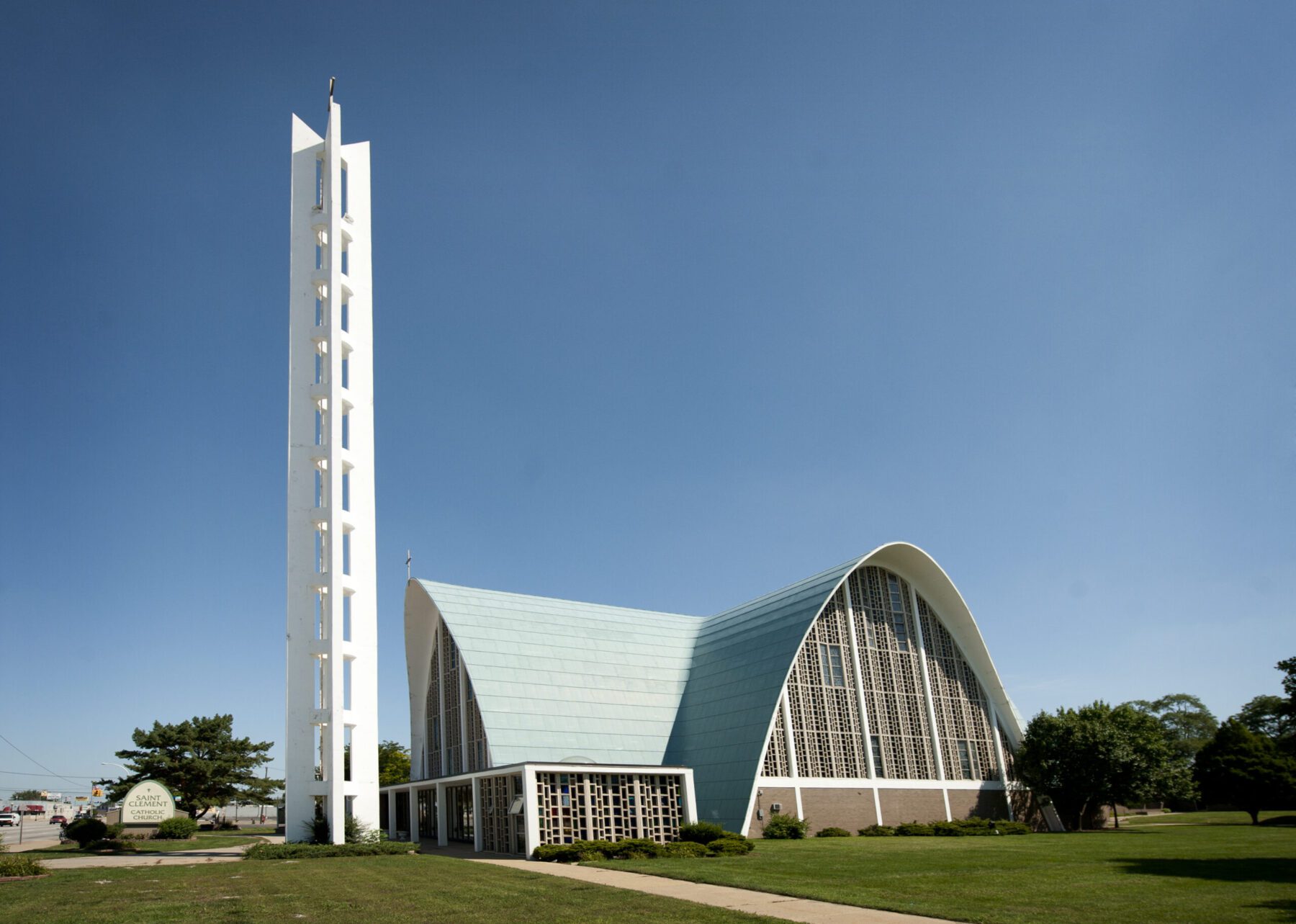 In 1958 a two-year pledge fund was initiated for the construction of a new church. Ground was broken in 1960 for what would be an extraordinary architectural statement in a prominent location on Van Dyke Boulevard. The architectural firm of Diehl and Diehl (formerly O’Dell, Trace and Diehl), which had completed a number of church projects in the Detroit area was selected to design the church. Father Murray’s wish that the design would “allow passersby to see right into the church without opening the door” was granted as the contemporary forms used by the architect include massive sixty-five-foot tall vaults infilled with walls of stained glass on each elevation. The church’s nave, at the center of the cruciform plan, accommodates sixteen hundred worshipers. Other distinctive features include an altar constructed of imported marble and a 130-foot tall concrete bell tower.