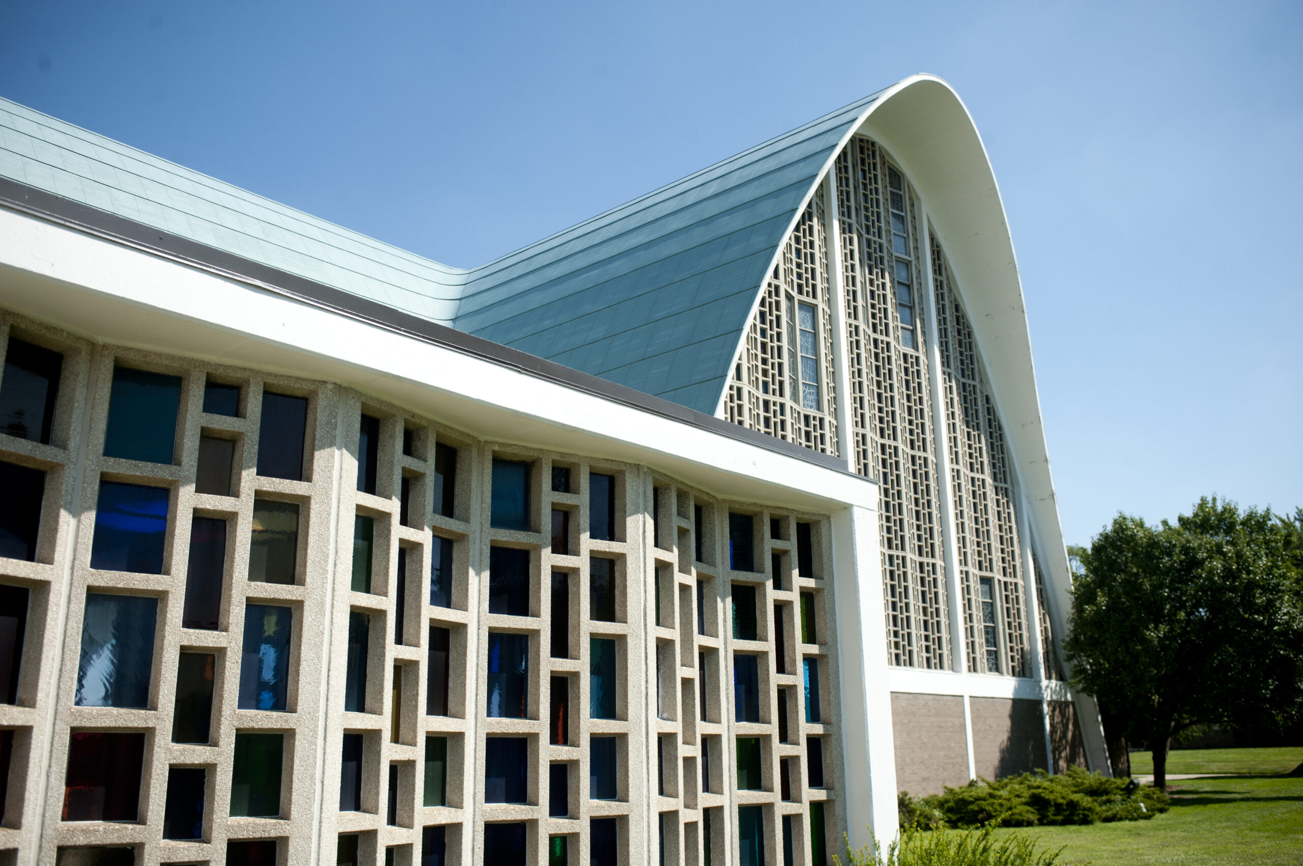 The cruciform-plan church is sited close to the street and oriented according to the compass points. A tall concrete spire or bell tower surmounted by a cross is located adjacent to the church providing a strong vertical element to the arrangement. The dramatic vaulted roof of the church extends to grade forming the exterior walls. Recessed within the vaults are undulating screen walls of small stained glass panes set within a heavy cast stone grid. Vertical concrete mullions divide each of the stained-glass wall elevations into five bays. Below the stained-glass walls, the first floor is clad with brown brick. A one-story colonnaded wing with a flat roof extends across the front of the primary elevation marking the entrance to the church. The walls of the wing are fully glazed aluminum curtain walls. At the end of the wing is a small adoration chapel clad with the same cast stone and stained glass assembly as the primary elevations.